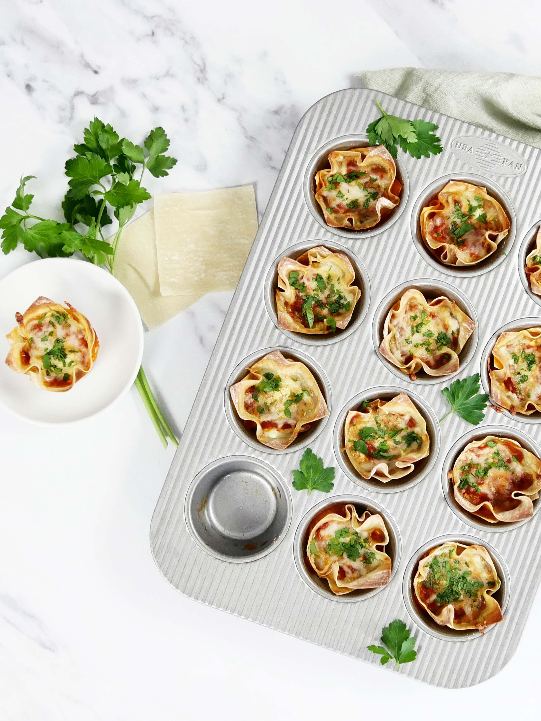 These lasagna cups boast a unique presentation and very big flavor! These are great if you don’t want to make an entire pan of lasagna for your family, or if you want to serve individual portions for dinner or a party.